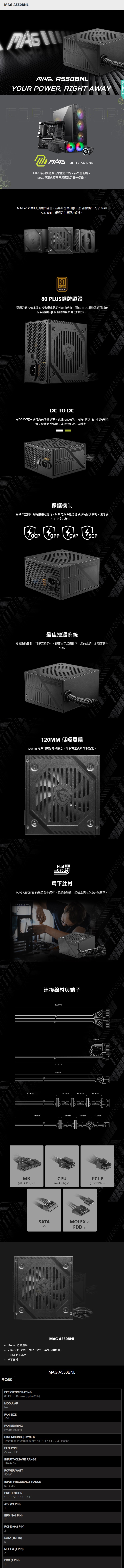 MSI 微星 MAG A550BNL 550W 80 Plus銅牌 電源供應器