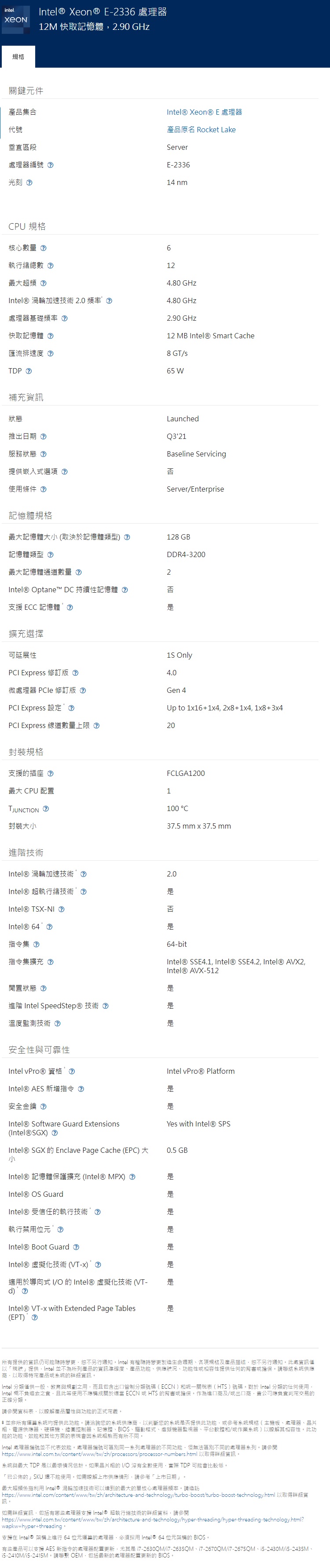 INTEL Xeon E-2336 6核12緒 盒裝中央處理器