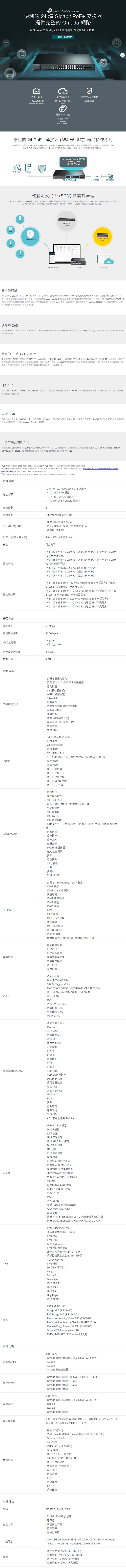 - 384 W PoE 供電: 24 個相容於 802.3at/af 的 PoE+ 連接埠,總供電為 384W。