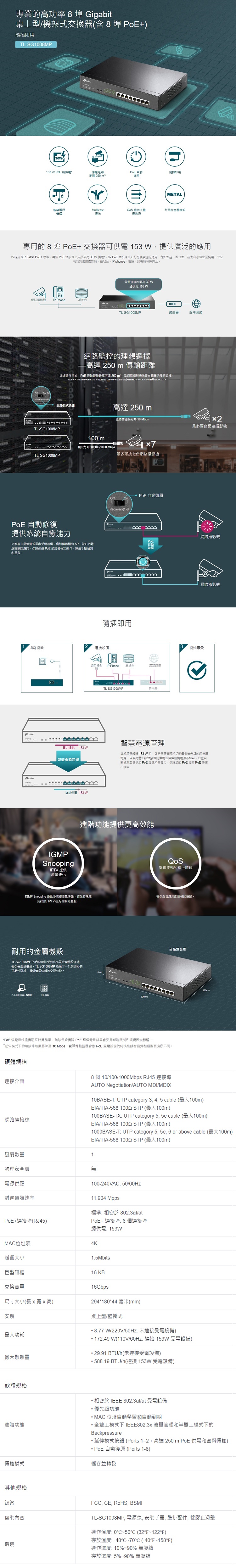 - 支援 PoE+ 標準,提供每埠最高 30W 以及總供電 153W的電力