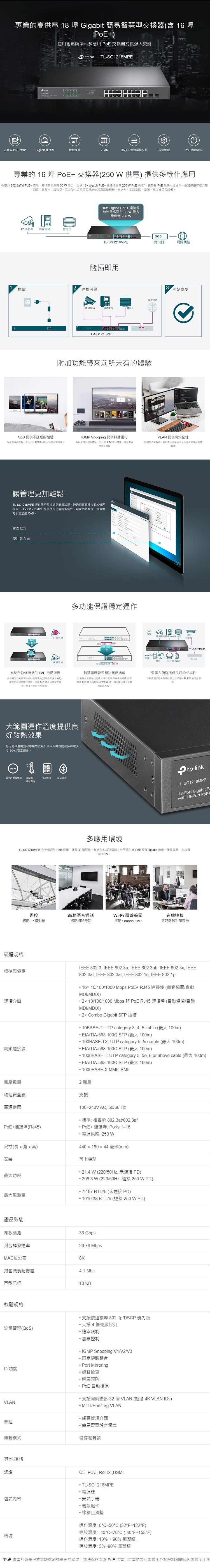 - 16× PoE+ gigabit RJ45 連接埠 + 2× gigabit 非 PoE RJ45 連接埠和 2× combo gigabit SFP 插槽。