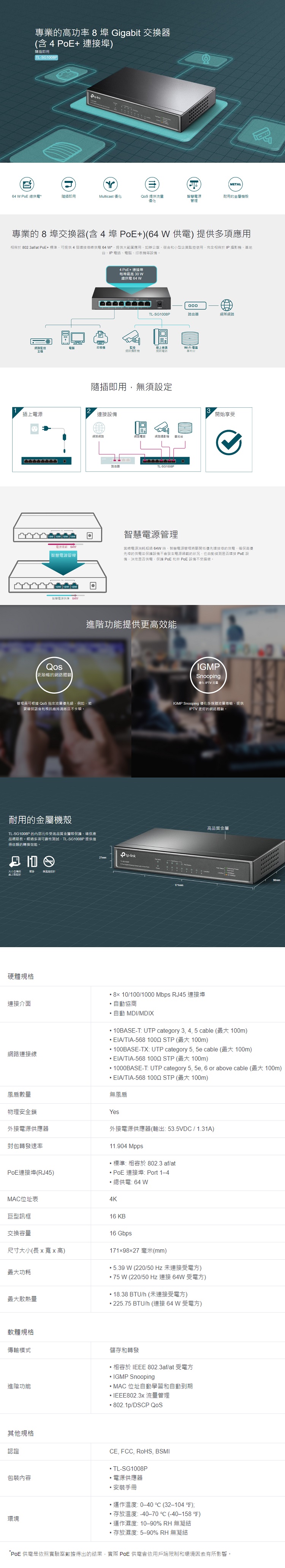 - 8× 10/100/1000 Mbps RJ45 連接埠