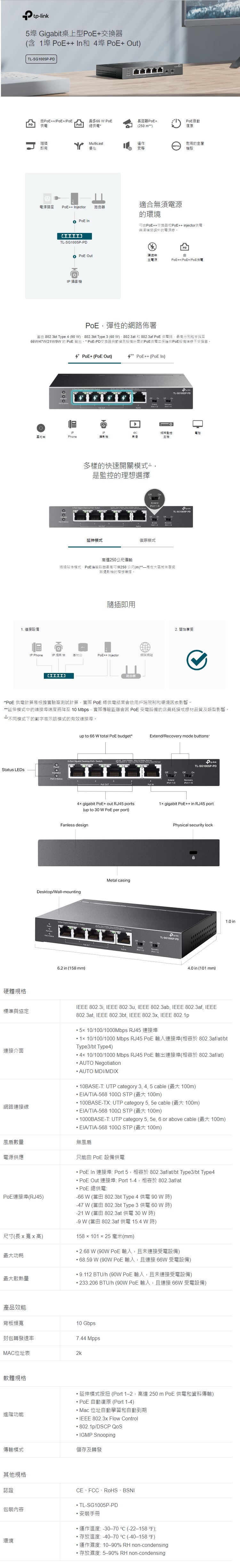 - 1 埠 Gigabit PoE++ 輸入和 4 埠 PoE+ 輸出: 當被802.3bt Type 4 / 802.3bt Type 3 / 802.3at / 802.3af PoE 標準供電時,分別支援高達 66 W / 47 W / 21 W/ 9 W PoE 電源輸出*