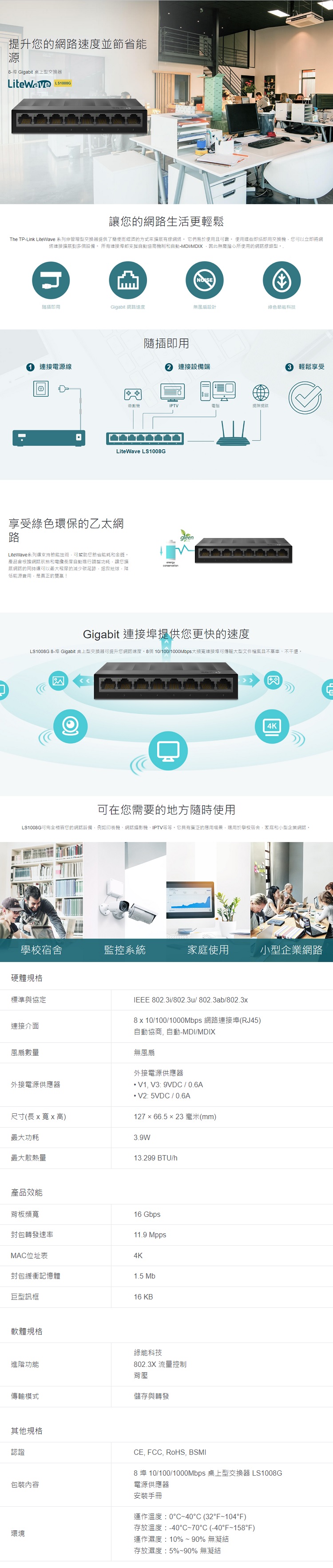 - 8 個 10/100/1000Mbps 自動 MDI/MDIX / 自動協商 RJ45 連接埠