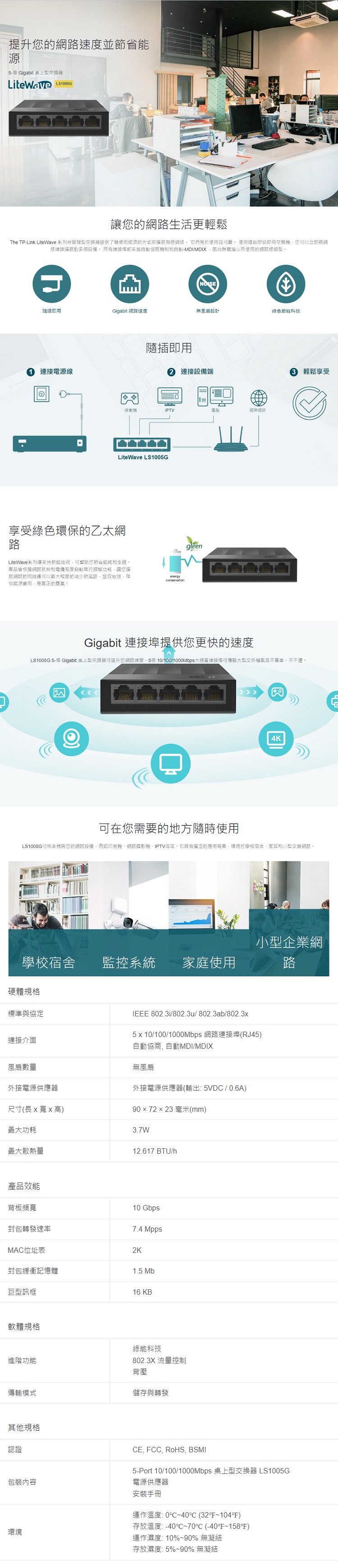 - 5 個 10/100/1000Mbps 自動 MDI/MDIX / 自動協商 RJ45 連接埠。