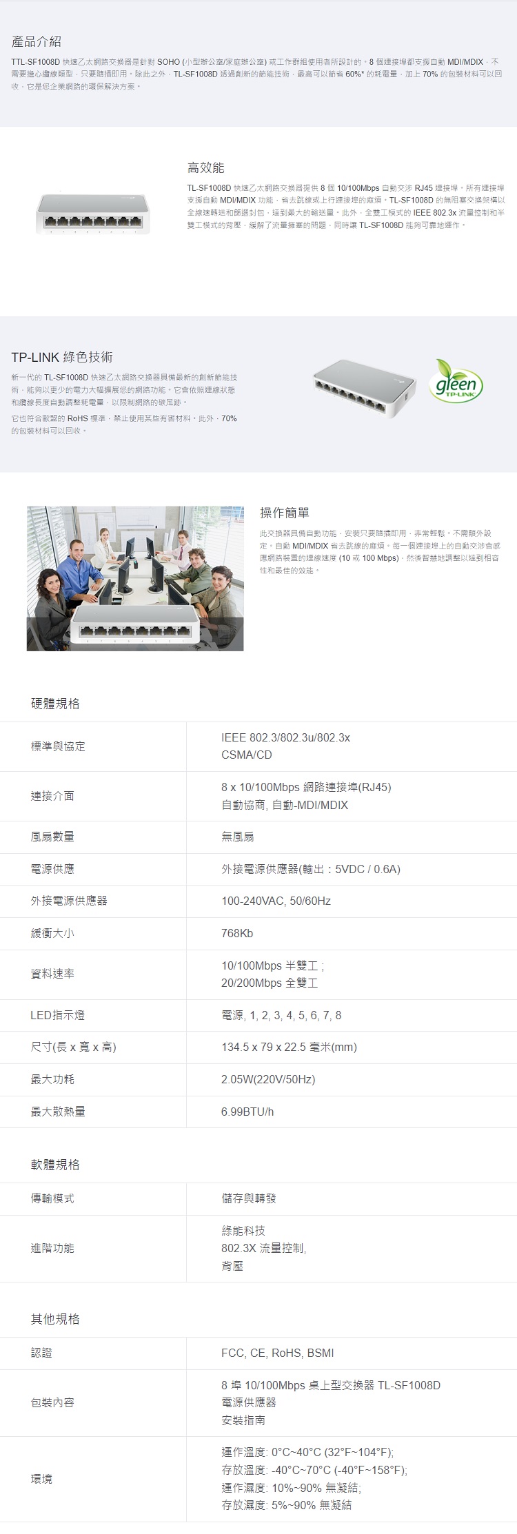 - 8 個 10/100Mbps 自動交涉 RJ45 連接埠,支援自動 MDI / MDIX。
