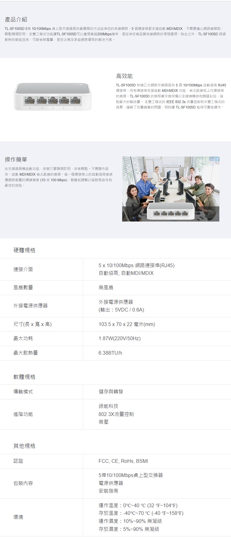 - 5 個 10/100Mbps 自動協商 RJ45 連接埠,支援自動 MDI / MDIX