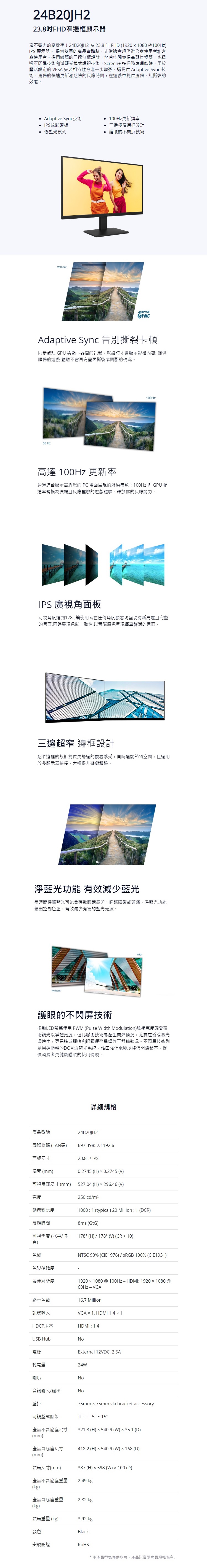 AOC 艾德蒙 24型 IPS FHD 護眼窄邊框螢幕 24B20JH2