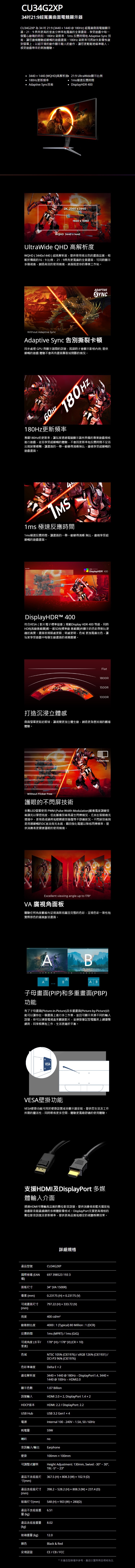AOC 艾德蒙 34型 VA 2K 180Hz 1500R 曲面電競螢幕 CU34G2XP