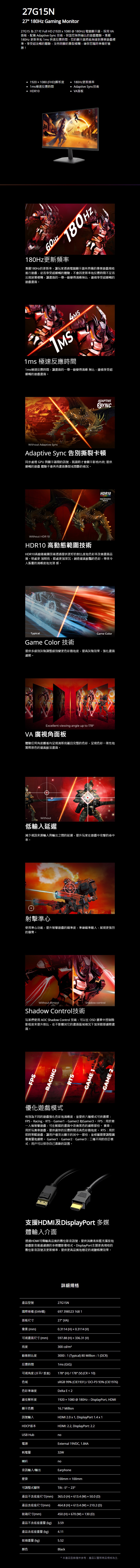 ●180Hz更新頻率及1ms反應時間