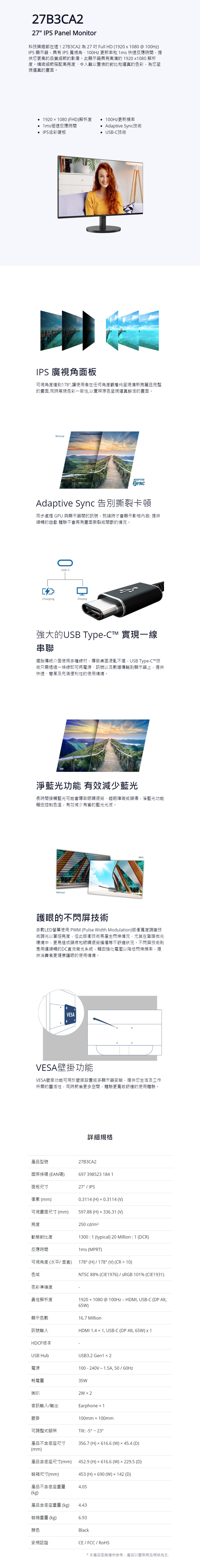AOC 艾德蒙 27型 窄邊框螢幕顯示器 27B3CA2