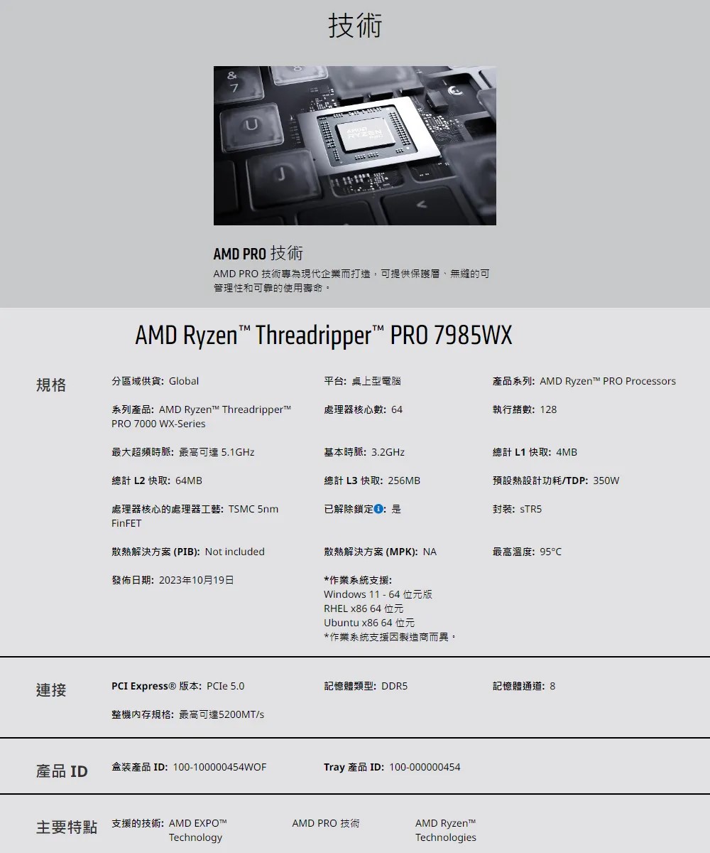 AMD Ryzen Threadripper PRO 7985WX 64核128緒 盒裝中央處理器 100-100000454WOF