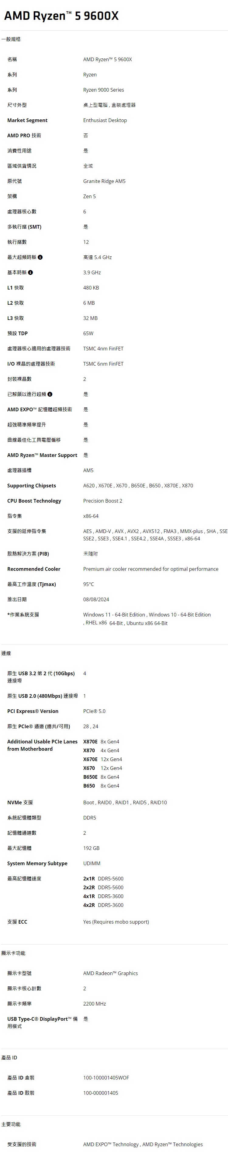 AMD Ryzen 5 9600X 6核12緒 盒裝中央處理器 100-100001405WOF