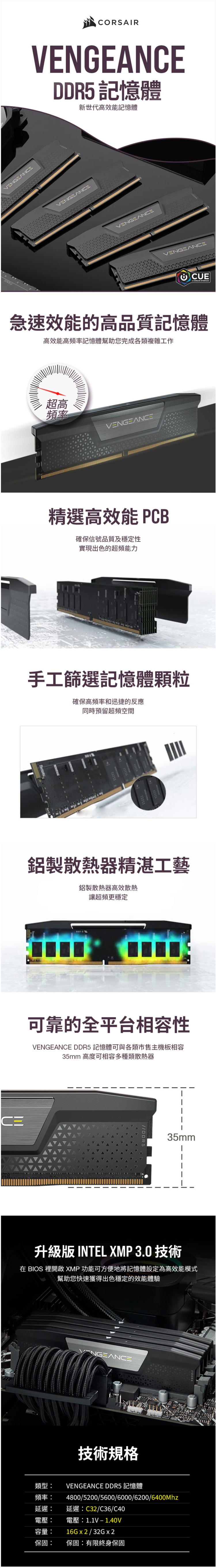 CORSAIR 海盜船 Vengeance 復仇者 DDR5 6400 32G(16GBx2) 超頻雙通記憶體(黑)(CL32) CMK32GX5M2B6400C32