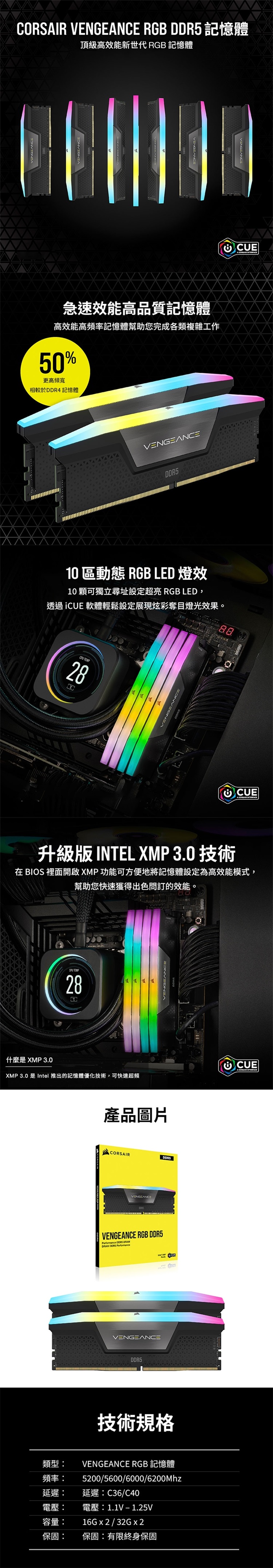 CORSAIR 海盜船 Vengeance 復仇者 RGB燈 DDR5 6000 32G(16GBx2) 超頻雙通記憶體(黑)(CL36) CMH32GX5M2E6000C36