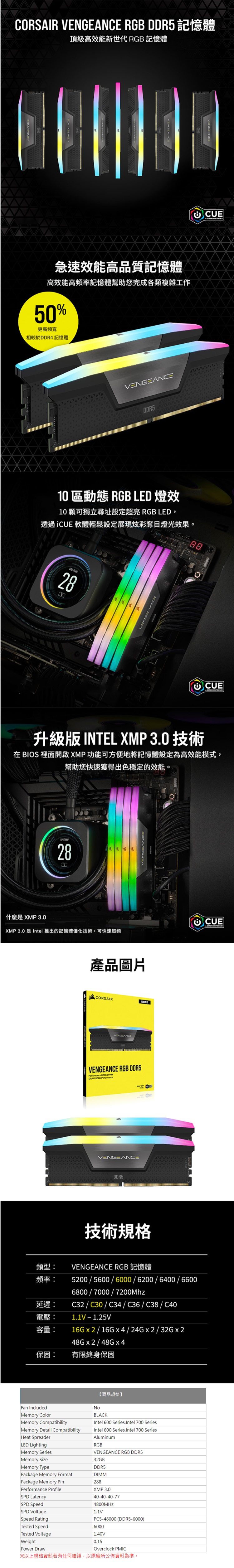 CORSAIR 海盜船 Vengeance 復仇者 RGB燈 DDR5 6000 32G(16GBx2) 超頻雙通記憶體(黑)(CL30) CMH32GX5M2B6000C30