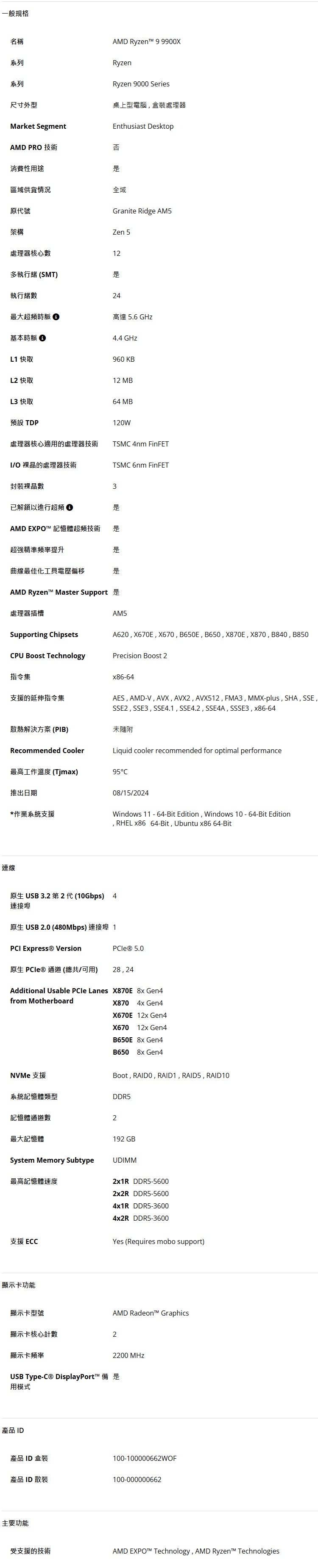 AMD Ryzen 9 9900X 12核24緒 盒裝中央處理器 100-100000662WOF