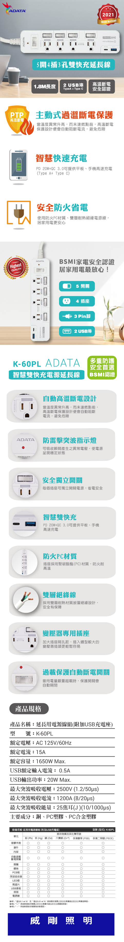 ADATA 威剛照明 5切4插3P+USB(A+C) 智慧快充延長線組 1.8M (K-60PL)