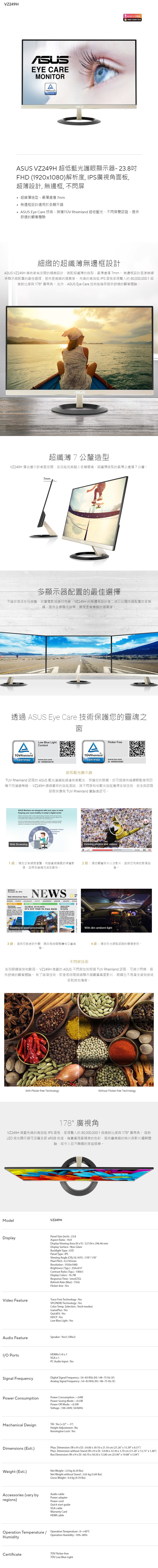ASUS 華碩 24型 FullHD 無邊框廣視角螢幕 VZ249H