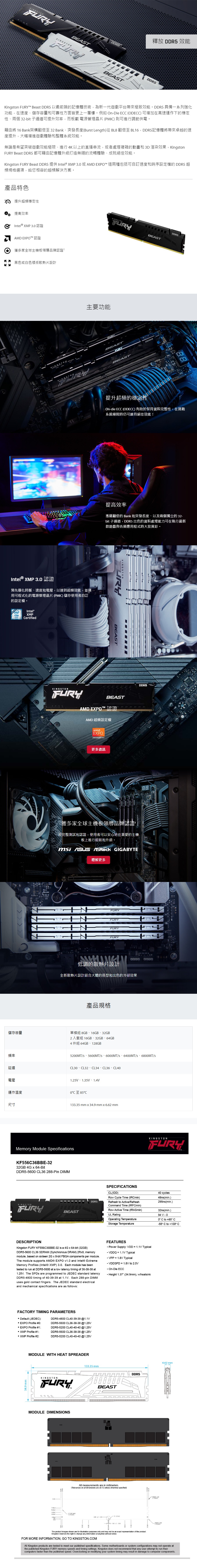 Kingston 金士頓 FURY Beast DDR5 5600 32GB 桌上型記憶體 KF556C36BBE-32