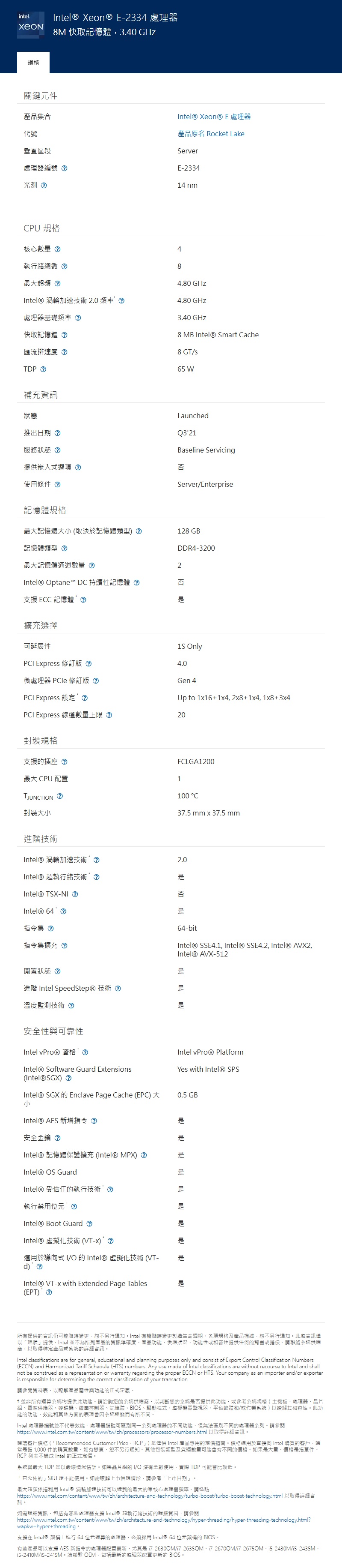 INTEL Xeon E-2334 4核8緒 盒裝中央處理器(台灣正式代理商貨源,非水貨)