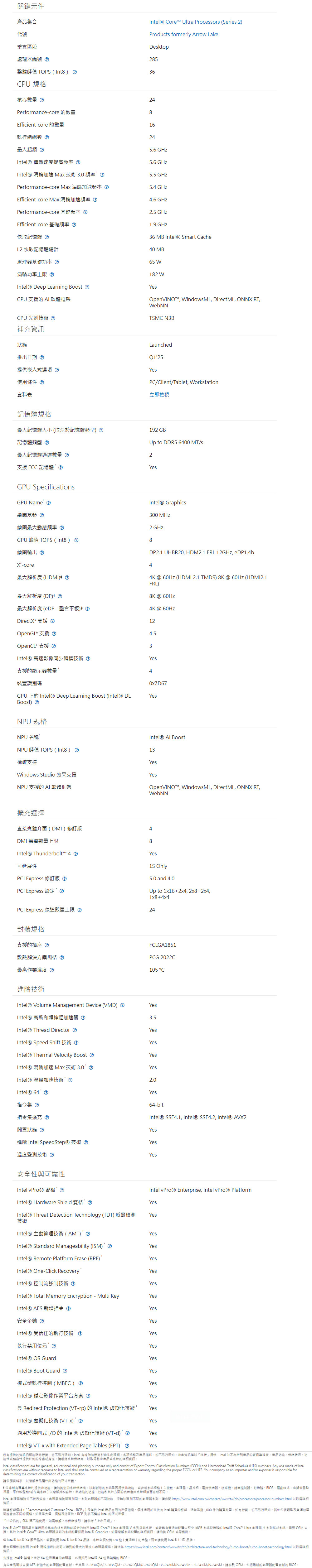 INTEL Core Ultra 9 285 24核24緒 盒裝中央處理器