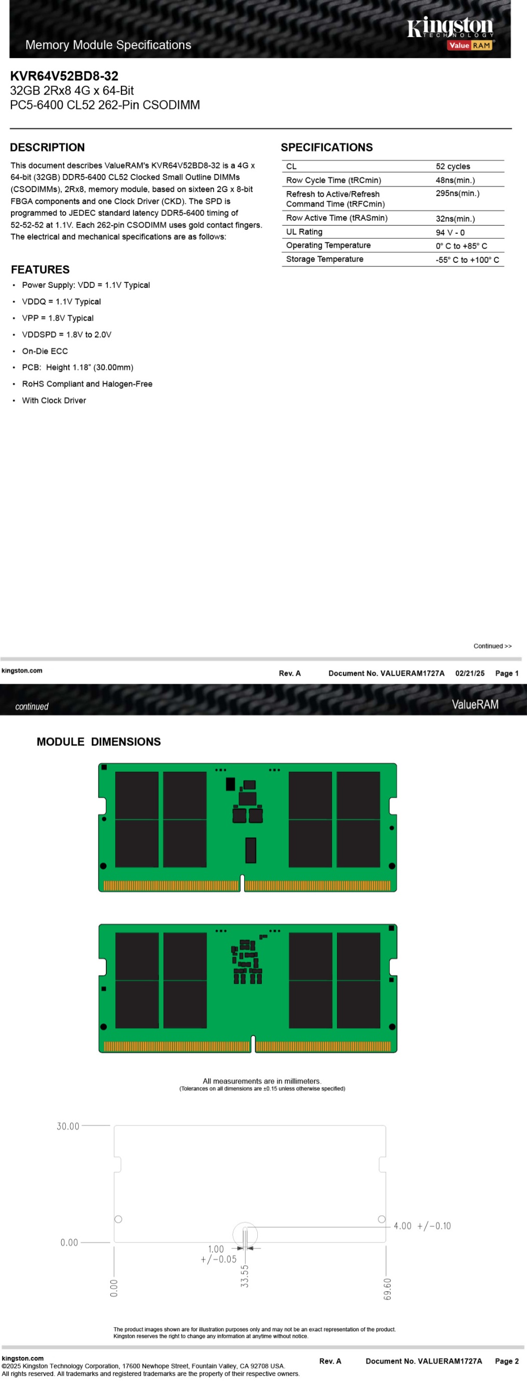 ●32GB DDR5 6400MT/s Non-ECC Clocked Unbuffered SODIMM