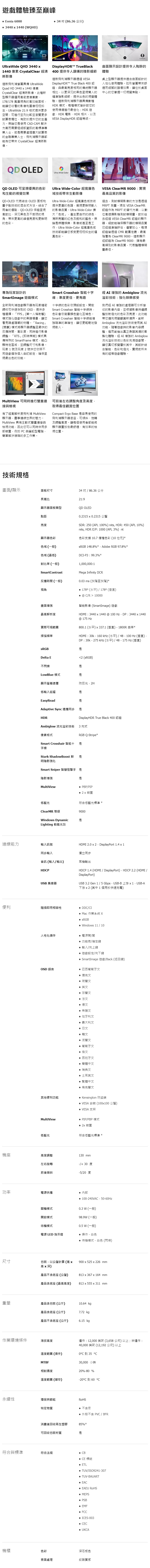PHILIPS 飛利浦 34型 2K QD OLED 曲面電競螢幕 34M2C6500