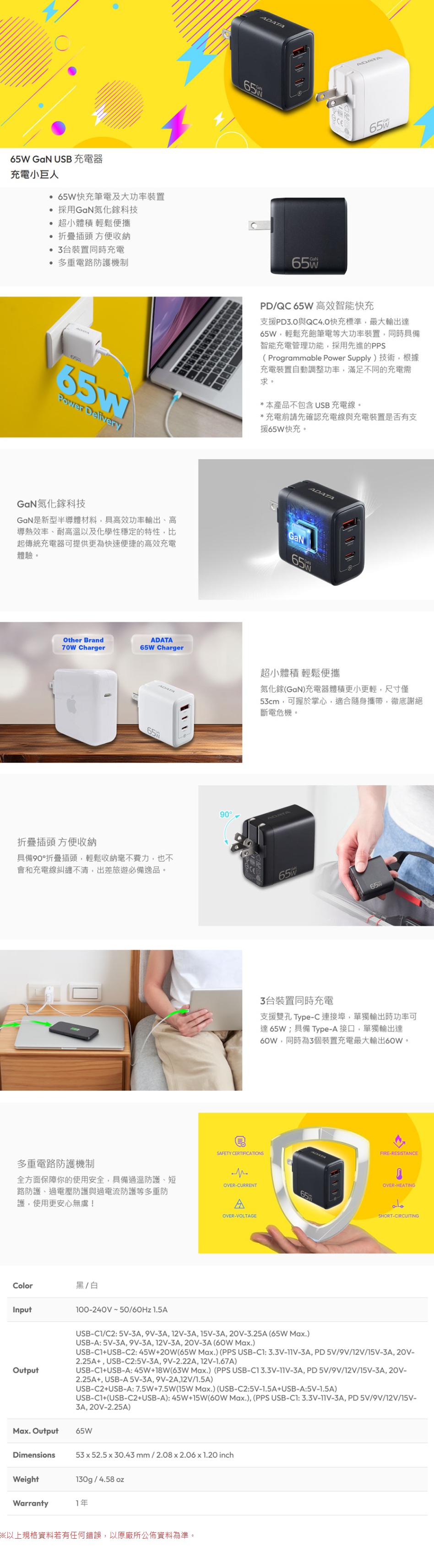 ADATA 威剛 65W GaN 氮化鎵超高速充電器(白)(3孔) CHARGERU-0653-QCPDWH