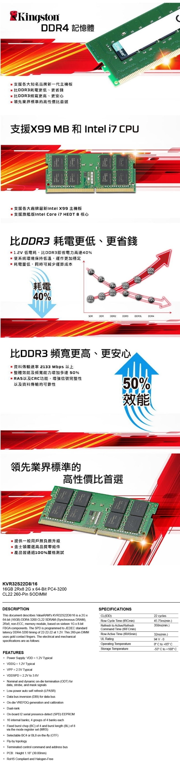 Kingston 金士頓 DDR4 3200 16G 筆記型記憶體 KVR32S22D8/16