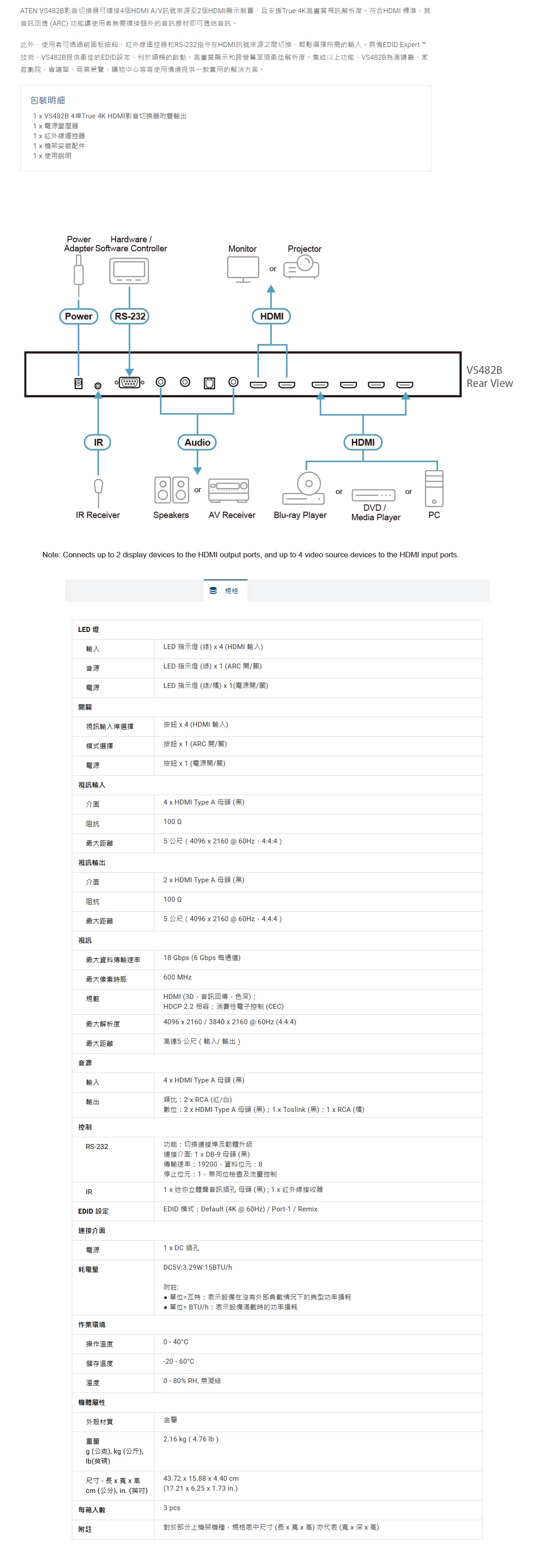 ATEN 4埠True 4K HDMI影音切換器附雙輸出 (VS482B)