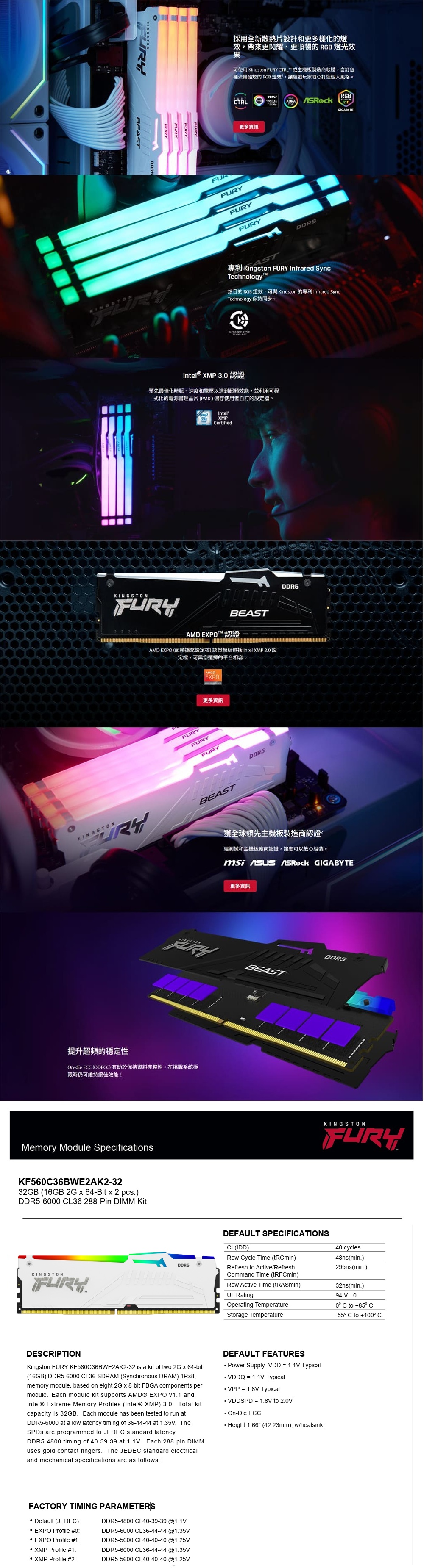 Kingston 金士頓 FURY Beast 獸獵者 RGB DDR5 6000 32G(16Gx2) 桌上型超頻記憶體(白) KF560C36BWE2AK2-32