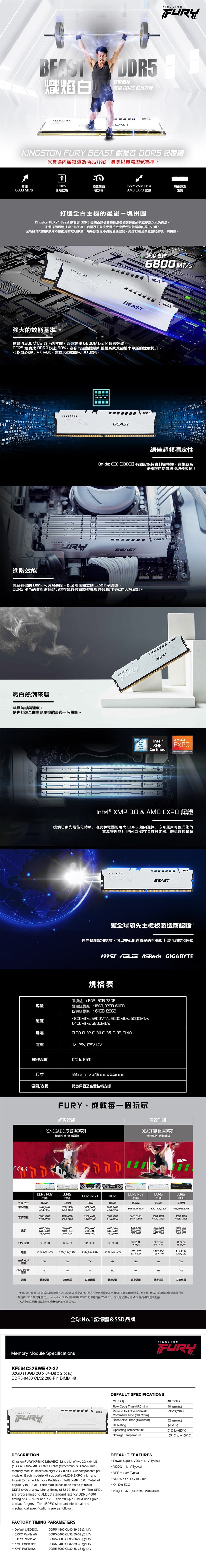 金士頓 FURY Beast DDR5 6400 32G(16Gx2) 記憶體(白) KF564C32BWEK2-32