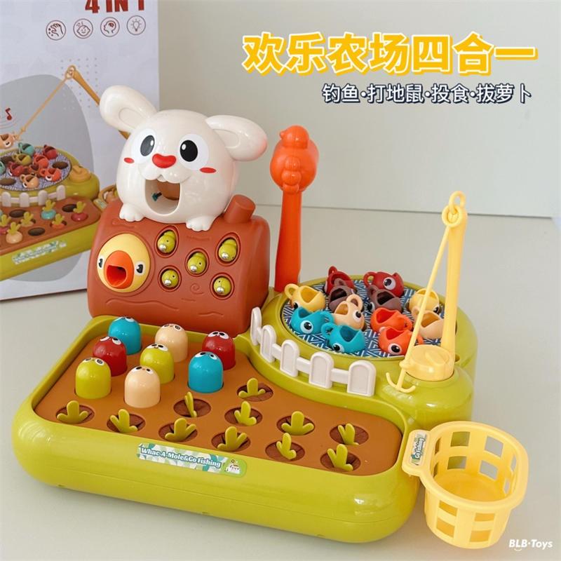 兒童歡樂農場打地鼠釣魚拔蘿蔔投餵4合1釣魚盤早期教育益智遊戲機玩具