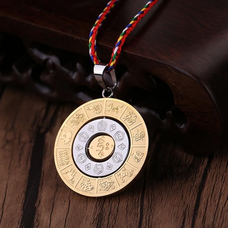 九宮八卦牌即為文殊九宮八卦圖正中的咒輪,正中分為三圈,外圈是十二生肖,是代表十二地支以紀年的十二種動物,配合天干演化成六十甲子。我們每人都有一個屬相。接人待物,往往遇到其它屬相之人,相生或相剋。如果有文殊九宮八卦圖在旁,則相當於擁有了十二種屬相,無論遇何人何事。則天、地、時、日、月、星、辰都會相生相合,萬事順意。