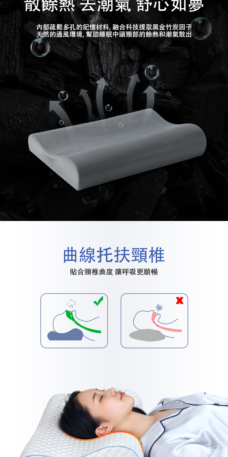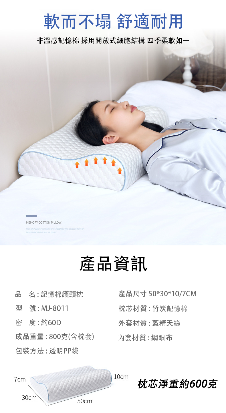外枕套是精選天絲面料, 枕芯高品質60D密度記憶棉。