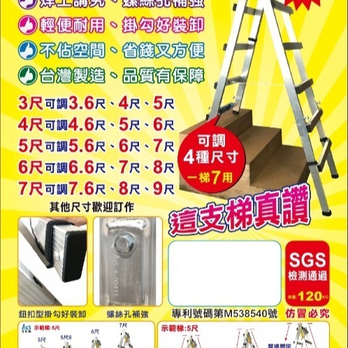 5尺可拉成5.6尺、6、7尺,梯重約7.5公斤