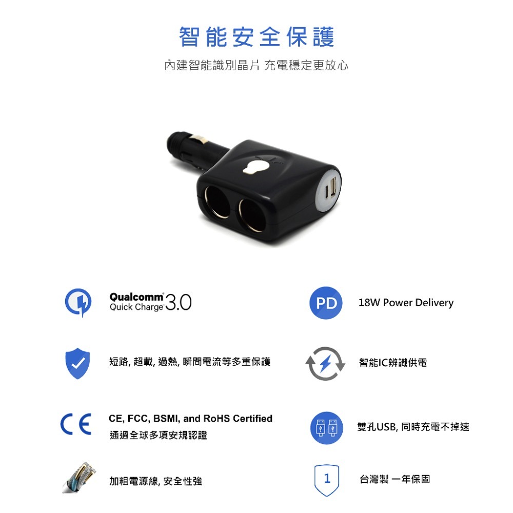 .Output Power (QC 3.0孔輸出功率):自動轉換5V/3A、9V/2A、12V/1.5A (18W MAX)