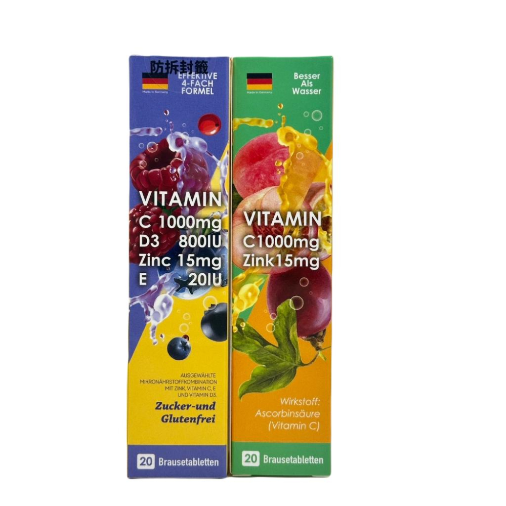 蝶芳 德國發泡錠 C1000+鋅 維生素C 熱帶水果風味(水蜜桃&百香果) CDE+鋅 野莓口味 20錠 維他命發泡錠