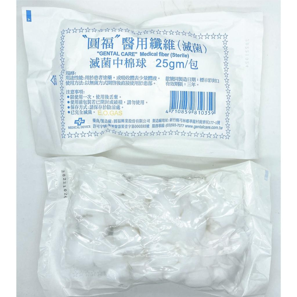 【圓福興業】圓福醫用纖維(滅菌)圓福中棉球 25gm/包 中棉球 滅菌棉球 醫用脫脂棉 棉球適用於 傷口清潔 化妝和護理