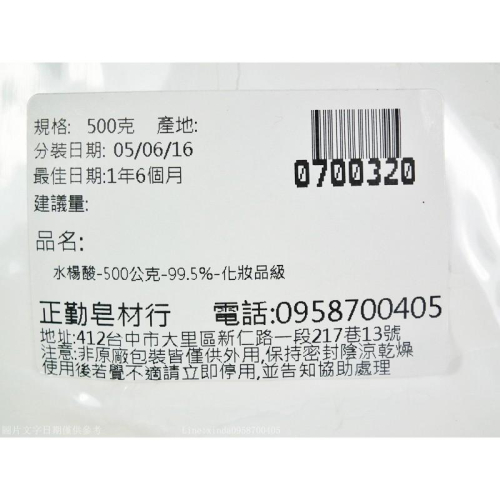 正勤含稅0700320-水楊酸-500公克-袋裝-法國-99.5%-化妝品級 需先預溶於酒精後加入水中