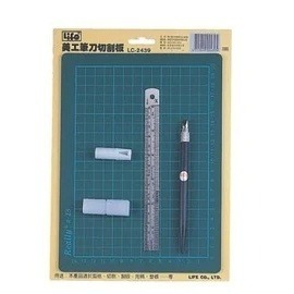 包裝:筆刀、鐵尺(15cm)、刀片、筆刀蓋、切割墊(刻度14*20cm)