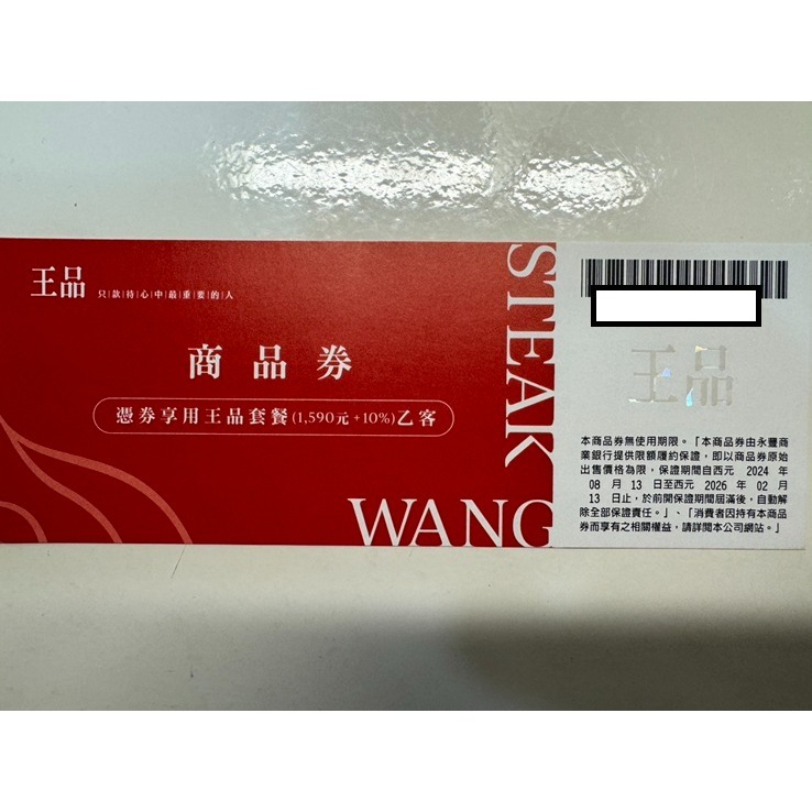 【王品牛排餐券】全省通用券,本商品券若因季節更替調整菜單或營業型態改變,可兌換等值商品(1590元+10%服務費),但不同價格之套餐不在此限,需補足禮券面額之差額始能兌換
