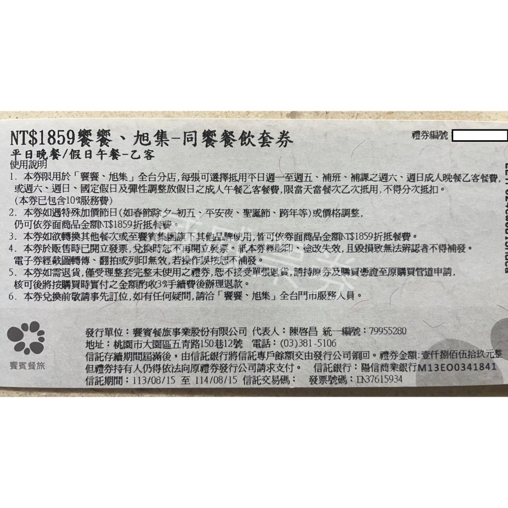 1.本券限用於「饗饗、旭集」全台分店,每張可選擇抵用平日週一至週五、補班、補課之週六、週日晚餐乙客餐費,或週六、週日、國定假日及彈性調整放假日之成人午餐乙客餐費,限當天當餐次乙次抵用,不得分次抵扣·(本券已包含10%服務費)