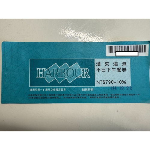 漢來海港餐廳 平日下午餐券 面額790+10%元