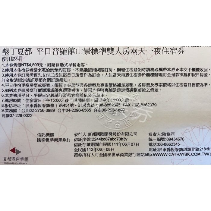 墾丁夏都 普羅山景標準雙人房 平日住宿一晚