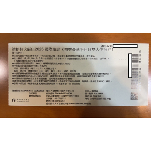 本券可抵用平旺日雙人豪華客房(一大床)住宿乙晚,依房型提供翌日早餐及一次性備品。