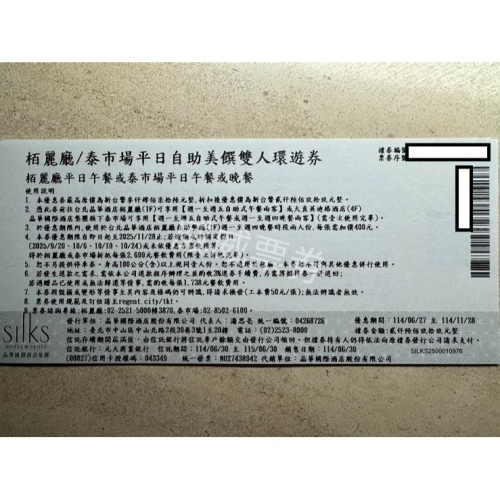 4.本券優惠期限自即日起至2025/11/28止:若逾期或於國定/特殊節日2025/09/29、10/06、10/10、10/24或未依優惠方案使用等,本券得於栢麗廳或秦市場折抵每張2,699元餐飲費用(限壹次折抵完畢)。