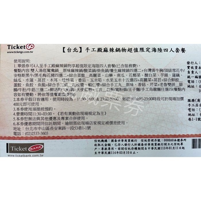 1.單張券可4人至手工殿麻辣鍋物享超值限定海陸四人套餐(已含服務費)。