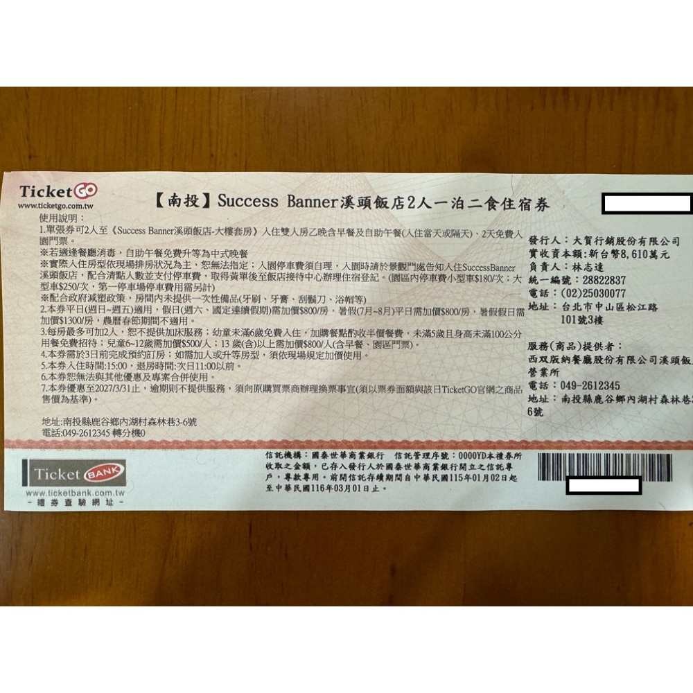 1.單張券可2人至《Success Banner溪頭飯店-大樓套房》入住雙人房乙晚含早餐及自助午餐(入住當天或隔天)、2天免費入園門票。